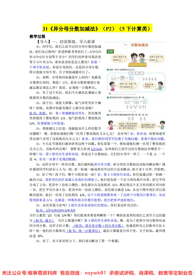 31《异分母分数加减法》(P2)(5下计算类)教学过程【导入】一、创设情境,导入新课☆:同学们,我们之前学过同分母分数的加减分数加减法法,你们还记得吗?那老师要考考你们了。4/5+2/5折纸和4/52/5分别等于多少?同学们的声音可真洪亮我新小老用了我新小角用了这等于6/5和2/5。谁来说说你是怎么算的?你第一个举手你来说。你说分母相同,这是同分母分数,○一其用了这张纸的几分之几:所以直接分母不变,分子相加减就可以了。0000☆:是啊,分母相同也就是什么相同?也就是日→图→田}分数单位相同,都是?1/5。看来分数想要进行加我国一岛,我锅一为减运算必须怎么样?真好,必须统一计数单位。用了这张铁的子,☆:有了这个共识,我们今天就在此基础上继续探究分数的加减法。口笑笑比淘气多用了这来纸的几分之几?算一算,☆:孩子们,请看大屏幕。淘气和笑笑在干嘛日→田田呀?折纸。从图中你能发现什么数学信息呢?-4--8答:板书:折纸。好,第1排戴眼镜的男生,你发现笑○分母不的分数怎样计算?算一算。说一说笑折纸用了整张纸的1/2,淘气折纸用了整张纸的是+音各号1/4。你观察能力可真强。☆:那根据以上信息,你能提出什么样的数学数,我可红相加减了。问题呢?哦,你想知道他们俩一共用了整张纸的几分之几?还有吗?好,你来说,你想知道笑笑比淘气多用了这张纸的几分之几?看来,我们班的同学不仅善于发现问题,更善于提出问题。☆:今天这节课我们就来研究这两个问题。首先看第一个,想知道他们俩一共用了整张纸的几分之几,该如何列式呢?我听见大家说12+14。这和我们之前学过的分数加法有哪里不一样呢?好,第3排的女生请你来说,你说这个分数加法,它们的分母不一样了,一个是2,一个是4。你有一双善于发现的眼睛。☆:这样分母不一样的分数,我们就叫做异分母分数,异分母的分数加法该如何解决呢?现在就请同学们前后4人为一组,折一折画一画或者用学过的方法来解决,给大家5分钟,开始吧。☆:好了吗?孩子们,哪个小组来说一说?好,第5小组你们来说。你们是通过折一折画一画的方法,那把你们的作品展示在我们的黑板上。他们是先将一个正方形的纸片对折,把它平均分成了2份,把其中1份涂上颜色,涂色部分占这张纸的1/2。然后将这个正方形的纸片再对折一次,把它平均分成4份,把其中的一份涂上颜色,涂色部分就是1/4。从这个图中我们可以清晰的看到,他们一共用了这张纸的3/4。这个小组借助图形统一了这两个分数的计数单位,从而得到结果是3/4,这就是一种数形结合的数学思想。我们把掌声送给他们。☆:还有其他方法吗?2组代表来说说你们的想法。你们是这样列式的。板书:1/2+1/4=24+1/4=3/4为什么要把1/2写成2/4呢?你们组谁来帮老师解答一下?噢你说是利用我们之前学习过的通分(板书:通分)为什么要通分呢?第4排的男生请你来说。噢,是为了把异分母分数转化成同分母分数,这样才好计算。(板书:异分母分数一同分母分数)也就是转化之后就可以怎么样?统一他们的分数单位(板书:统一计数单位)最后计算就是分母不变,分子相加。最终得出是3/4。☆:好了,在大家的努力下,我们成功解决了第一个难题。关注公众号:准事易资料库售后微信:5yk01承接试讲稿、说课稿、教案等定制业务