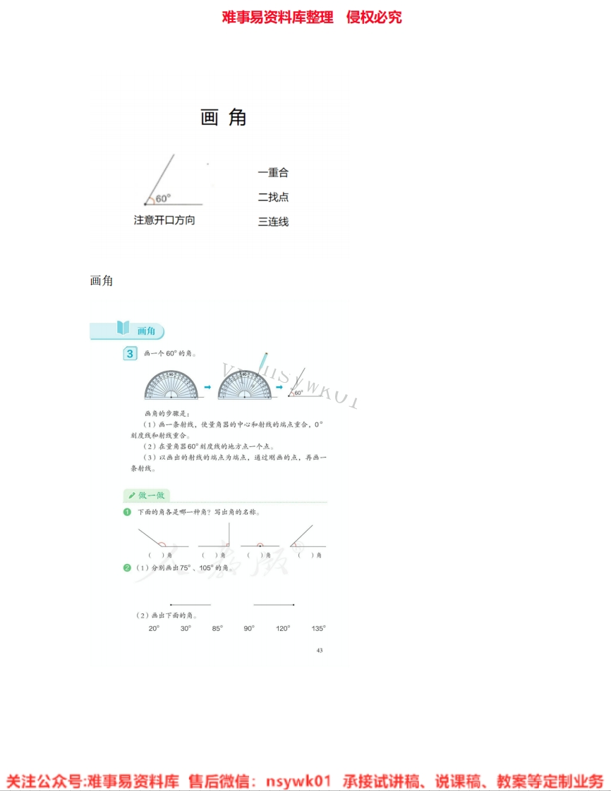 难事易资料库整理侵权必究画角一重合60二找点注意开口方向三连线画角画角3画一个60°的角WKU画角的步骤是:(1)画一条射线,使量角渴的中心和射线的端.点重合。0创度线和精线重合。(2)在量角器60°刻度线的地方点一个点。(3)以画出的射线的鸿点为烤点,通过刚画的点,再画一条射线。2做一做①下面的角各是哪一种角?写出角的名称()角()角()角②(1)分别画出75°、105°的角(2)画出下面的角20°30°8590°120°13543关注公众号:难事易资料库售后微信:5ywk01承接试讲稿、说课稿、教案等定制业务