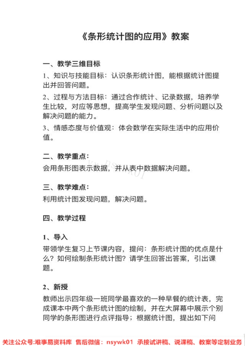 《条形统计图的应用》教案一、教学三维目标1、知识与技能目标:认识条形统计图,能根据统计图提出并回答问题。2、过程与方法目标:通过合作统计、记录数据,培养学生比较,对应等思想,提高学生发现问题、分析问题以及解决问题的能力。3、情感态度与价值观:体会数学在实际生活中的应用价值。二、教学重点:会用条形图表示数据,并从表中数据解决问题。三、教学难点:利用统计图发现问题,解决问题。四、教学过程1、导入带领学生复习上节课内容,提问:条形统计图的优点是什么?如何绘制条形统计图?请学生回答出答案,引出课题。2、新授教师出示四年级一班同学最喜欢的一种早餐的统计表,完成课本中两个条形统计图的绘制,并在大屏幕中展示个别同学的条形图进行点评指导;根据统计图,提出如下问关注公众号:难事易资料库售后微信:5ywk01承接试讲稿、说课稿、教案等定制业务