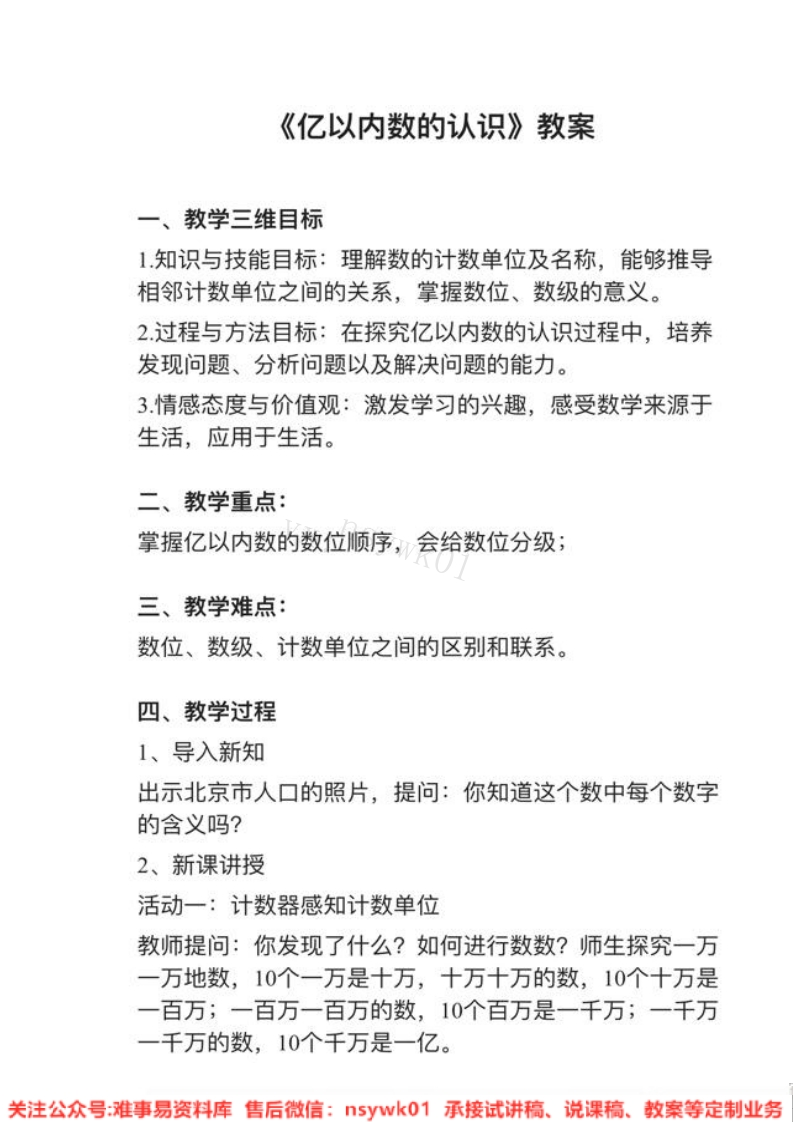《亿以内数的认识》教案一、教学三维目标1知识与技能目标:理解数的计数单位及名称,能够推导相邻计数单位之间的关系,掌握数位、数级的意义。2过程与方法目标:在探究亿以内数的认识过程中,培养发现问题、分析问题以及解决问题的能力。3情感态度与价值观:激发学习的兴趣,感受数学来源于生活,应用于生活。二、教学重点:掌握亿以内数的数位顺序,会给数位分级:三、教学难点:数位、数级、计数单位之间的区别和联系。四、教学过程1、导入新知出示北京市人口的照片,提问:你知道这个数中每个数字的含义吗?2、新课讲授活动一:计数器感知计数单位教师提问:你发现了什么?如何进行数数?师生探究一万一万地数,10个一万是十万,十万十万的数,10个十万是百万;一百万一百万的数,10个百万是一千万;一千万一千万的数,10个千万是一亿。关注公众号:难事易资料库售后微信:5ywk01承接试讲稿、说课稿、教案等定制业务