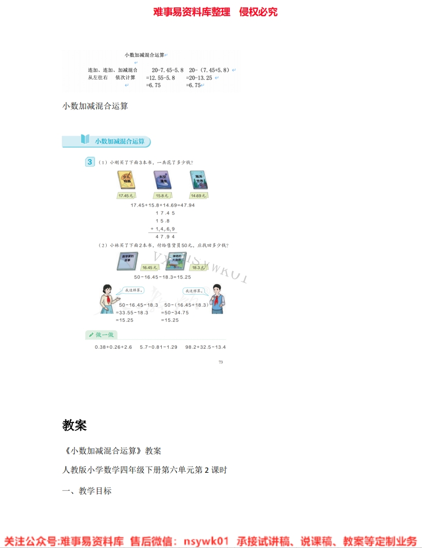 难事易资料库整理侵权必究小数加减混合运算连加、连加、加减混合20-7.45-5.820-(7.45+5.8)从左往右依次计算=12.55-5.8=20-13.254=6.75=6.75小数加减混合运算小数加减混合运算3(1)小附买了下面3本书,一共花了多少钱1745元15.B元1469元17.45+15.8+14.69=47.9417.4515.8+1,4,6,947.94(2)小林买了下面2本书,付给售赁员50元,应找回多少钱?1645元50-16.45-18.3=15.25冰WKU1衣这样算。我追样界。50-16.45-18.350-(16.45+18.3=33.55-18.3=50-34.75=15.25=15.252做一做0.38+0.26+2.65.7-0.81-1.2998.2+32.5-13.473教案《小数加减混合运算》教案人教版小学数学四年级下册第六单元第2课时一、教学目标关注公众号:难事易资料库售后微信:5ywk01承接试讲稿、说课稿、教案等定制业务