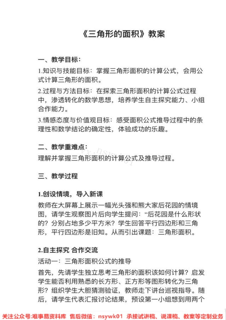 《三角形的面积》教案一、教学目标:1知识与技能目标:掌握三角形面积的计算公式,会用公式计算三角形的面积。2过程与方法目标:在探索三角形面积的计算公式过程中,渗透转化的数学思想,培养学生自主探究能力、小组合作能力。3情感态度与价值观目标:感受面积公式推导过程中的条理性和数学结论的确定性,体验成功的乐趣。二、教学重难点:理解并掌握三角形面积的计算公式及推导过程。三、教学过程1.创设情境,导入新课教师在大屏幕上展示一幅光头强和熊大家后花园的情境图,请学生观察图片后向学生提问:“后花园是什么形状的?分别占地多少平方米?学生回答平行四边形和三角形,平行四边形是旧知。从而引出课题:三角形面积。2.自主探究合作交流活动一:三角形面积公式的推导首先,先请学生独立思考三角形的面积该如何计算?启发学生能否利用熟悉的长方形、正方形等图形转化为三角形?组织学生大胆猜测验证,教师走下讲台巡视指导。随后,请学生代表汇报讨论结果,预设第一小组想到用两个关注公众号:难事易资料库售后微信:5ywk01承接试讲稿、说课稿、教案等定制业务