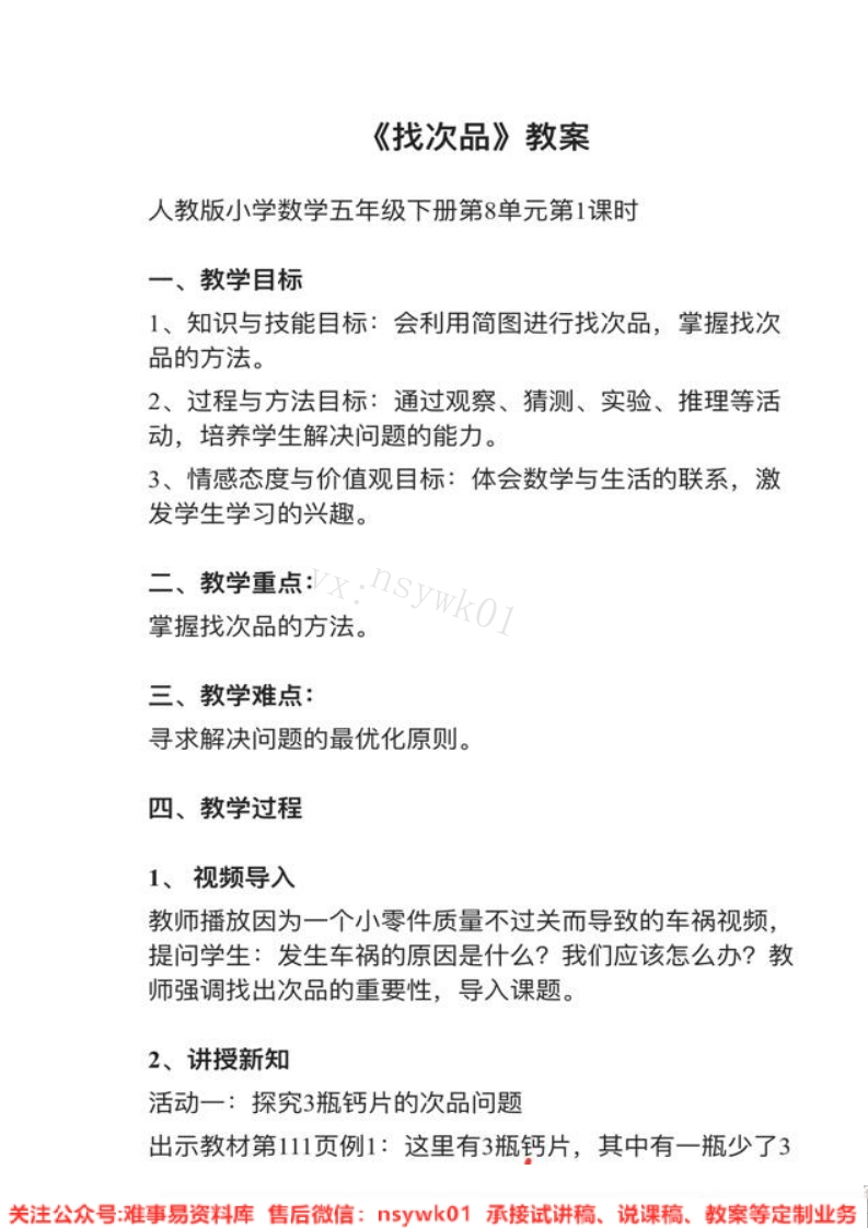 《找次品》教案人教版小学数学五年级下册第8单元第1课时一、教学目标1、知识与技能目标:会利用简图进行找次品,掌握找次品的方法。2、过程与方法目标:通过观察、猜测、实验、推理等活动,培养学生解决问题的能力。3、情感态度与价值观目标:体会数学与生活的联系,激发学生学习的兴趣。二、教学重点::1Sy以0掌握找次品的方法。三、教学难点:寻求解决问题的最优化原则。四、教学过程1、视频导入教师播放因为一个小零件质量不过关而导致的车祸视频,提问学生:发生车祸的原因是什么?我们应该怎么办?教师强调找出次品的重要性,导入课题。2、讲授新知活动一:探究3瓶钙片的次品问题出示教材第111页例1:这里有3瓶钙片,其中有一瓶少了3关注公众号:难事易资料库售后微信:5ywk01承接试讲稿、说课稿、教案等定制业务