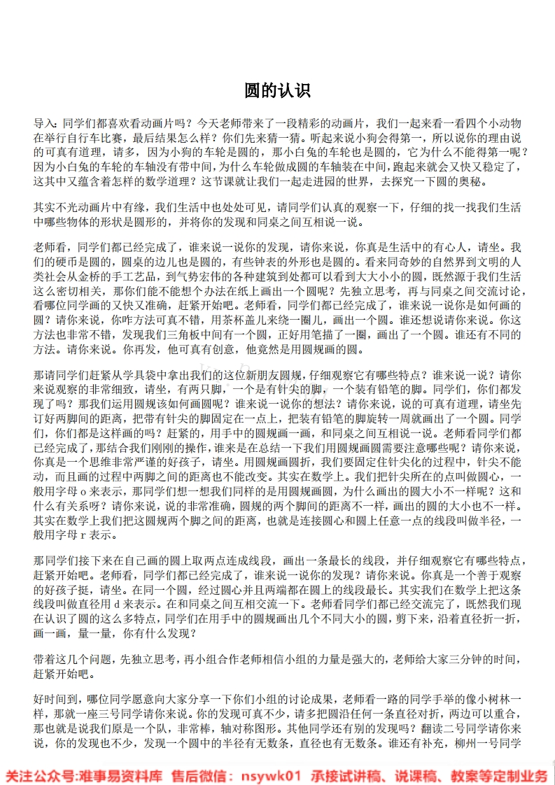 圆的认识导入:同学们都喜欢看动画片吗?今天老师带来了一段精彩的动画片,我们一起来看一看四个小动物在举行自行车比赛,最后结果怎么样?你们先来猜一猜。听起来说小狗会得第一,所以说你的理由说的可真有道理,请多,因为小狗的车轮是圆的,那小白兔的车轮也是圆的,它为什么不能得第一呢?因为小白兔的车轮的车轴没有带中间,为什么车轮做成圆的车轴装在中间,跑起来就会又快又稳定了,这其中又蕴含着怎样的数学道理?这节课就让我们一起走进园的世界,去探究一下圆的奥秘。其实不光动画片中有缘,我们生活中也处处可见,请同学们认真的观察一下,仔细的找一找我们生活中哪些物体的形状是圆形的,并将你的发现和同桌之间互相说一说。老师看,同学们都已经完成了,谁来说一说你的发现,请你来说,你真是生活中的有心人,请坐。我们的硬币是圆的,圆桌的边儿也是圆的,有些钟表的外形也是圆的。看来同奇妙的自然界到文明的人类社会从金桥的手工艺品,到气势宏伟的各种建筑到处都可以看到大大小小的圆,既然源于我们生活这么密切相关,那你们能不能想个办法在纸上画出一个圆呢?先独立思考,再与同桌之间交流讨论,看哪位同学画的又快又准确,赶紧开始吧。老师看,同学们都已经完成了,谁来说一说你是如何画的圆?请你来说,你咋方法可真不错,用茶杯盖儿来绕一圈儿,画出一个圆。谁还想说请你来说。你这方法也非常不错,发现我们三角板中间有一个圆,正好用笔描了一圈,画出了一个圆。谁还有不同的方法。请你来说。你再发,他可真有创意,他竞然是用圆规画的圆。那请同学们赶紧从学具袋中拿出我们的这位新朋友圆规,仔细观察它有哪些特点?谁来说一说?请你来说观察的非常细致,请坐,有两只脚,一个是有针尖的脚,一个装有铅笔的脚。同学们,你们都发现了吗?那我们运用圆规该如何画圆呢?谁来说一说你的想法?请你来说,说的可真有道理,请坐先订好两脚间的距离,把带有针尖的脚固定在一点上,把装有铅笔的脚旋转一周就画出了一个圆。同学们,你们都是这样画的吗?赶紧的,用手中的圆规画一画,和同桌之间互相说一说。老师看同学们都已经完成了,那结合我们刚刚的操作,谁来是在总结一下我们用圆规画圆需要注意哪些呢?请你来说,你真是一个思维非常严谨的好孩子,请坐。用圆规画圆折,我们要固定住针尖化的过程中,针尖不能动,而且画的过程中两脚之间的距离也不能改变。其实在数学上。我们把针尖所在的点叫做圆心,一般用字母0来表示,那同学们想一想我们同样的是用圆规画圆,为什么画出的圆大小不一样呢?这和什么有关系呀?请你来说,说的非常准确,圆规的两个脚间的距离不一样,画出的圆的大小也不一样。其实在数学上我们把这圆规两个脚之间的距离,也就是连接圆心和圆上任意一点的线段叫做半径,一般用字母r表示。那同学们接下来在自己画的圆上取两点连成线段,画出一条最长的线段,并仔细观察它有哪些特点,赶紧开始吧。老师看,同学们都已经完成了,谁来说一说你的发现?请你来说。你真是一个善于观察的好孩子挺,请坐。在同一个圆,经过圆心并且两端都在圆上的线段最长。其实我们在数学上把这条线段叫做直径用来表示。在和同桌之间互相交流一下。老师看同学们都已经交流完了,既然我们现在认识了圆的这么多特点,同学们在用手中的圆规画出几个不同大小的圆,剪下来,沿着直径折一折,画一画,量一量,你有什么发现?带着这几个问题,先独立思考,再小组合作老师相信小组的力量是强大的,老师给大家三分钟的时间,赶紧开始吧。好时间到,哪位同学愿意向大家分享一下你们小组的讨论成果,老师看一路的同学手举的像小树林一样,那就一座三号同学请你来说。你的发现可真不少,请多把圆沿任何一条直径对折,两边可以重合,那也就是说我们原是一个队,非常棒,轴对称图形。其他同学还有别的发现吗?翻读二号同学请你来说,你的发现也不少,发现一个圆中的半径有无数条,直径也有无数条。谁还有补充,柳州一号同学关注公众号:难事易资料库售后微信:5ywk01承接试讲稿、说课稿、教案等定制业务