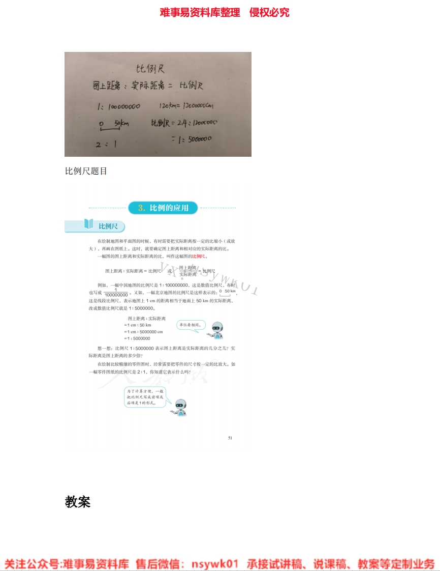 难事易资料库整理侵权必究比例尺圆上距路:皇际距斋二比例R/人1000000012okm=|200o000ch1。5比例R=24:1oco00211:500o00比例尺题目3.比例的应用比例尺在绘制地图和平面图的时候。有时需要把实际距离按一定的比第小(或放大)。再面在雨纸上。这时,就要确定图上距离和相对应的实际距离的比幅图的图上距离和实际距离的比。叫作这幅图的比例尺,图上距离:实际距离=比例尺要y恤,中电图的比R是1:o0o0.这是销比阀a个)也写成10000000。又如。一解北京地图的比例尺是这样表示的:050km这是线段比例尺,表示地图上1cm的距离相当于地面上50km的实际距离,改成数值比例尺就是1:5000000。图上距南:实际距肉=1cm 50 km单位要相间。=1cm:5000000cm=1:5000000想一想:比例尺1:5000000表示图上距离是实际距离的儿分之几?实际距离是图上距离的多少倍?在绘制比较精细的零件图时。经常需要把零件的尺寸按一定的比放大。如幅零件图纸的比例尺是2:1,你知道它表示什么吗?为了计算方使。一极把比闲尺写成前项友后项是1的形式教案关注公众号:难事易资料库售后微信:5ywk01承接试讲稿、说课稿、教案等定制业务