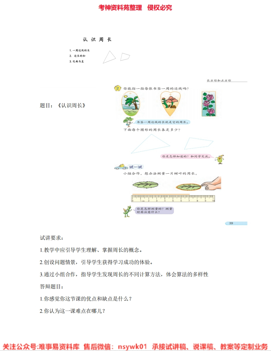 考神资料苑整理侵权必究认识周长1.一周边钱的长2边长的和3.化曲为直长方和王方②你能指一指每张书签一周的边线吗?题目:《认识周长》书签一周边线的长就是它的周长。下面每个图形的周长各是多少?你是怎样知道的?和同学交洗。%2试一试小组合作,想办法测量一片树叶的周长。T你是怎样洲量的?洲量时要注意什么?39试讲要求:1.教学中应引导学生理解、掌握周长的概念。2.创设问题情景,引导学生获得学习成功的体验。3.通过小组合作,指导学生发现周长的不同计算方法,体会算法的多样性答辩题目:1你感觉你这节课的优点和缺点是什么?2.你认为这一课难点在哪儿?关注公众号:难事易资料库售后微信:5ywk01承接试讲稿、说课稿、教案等定制业务