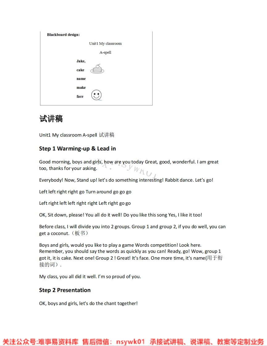 Blackboard design:Unit1 My classroomA-spellJake,cakenamemakeface试讲稿Unit1 My classroom A-spell试讲稿Step 1 Warming-up Lead inGood morning,boys and girls,how are you today Great,good,wonderful.I am greattoo,thanks for your asking.yKUEverybody!Now,Stand up!let's do something interesting!Rabbit dance.Let's go!Left left right right go Turn around gogo goLeft right leftleft right right Left right go goOK,Sit down,please!You all do it well!Do you like this song Yes,I like it too!Before class,I will divide you into 2 groups.Group 1 and group 2,if you do well,you canget a coconut.(板书)Boys and girls,would you like to play a game Words competition!Look here.Remember,you should say the words as quickly as you can!Ready,go!Wow,group 1got it,it is cake.Next one!Group2!Great!lt's face.One more time,it's name(用于衔接的词).My class,you all did it well.I'm so proud of you.Step 2 PresentationOK,boys and girls,let's do the chant together!关注公众号:难事易资料库售后微信:5ywk01承接试讲稿、说课稿、教案等定制业务