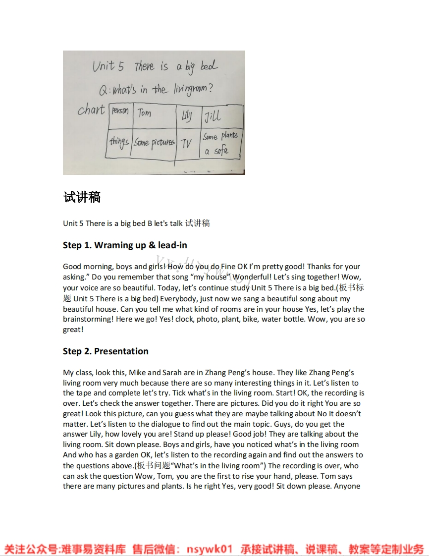 Unit5 There is a bi的beLwhat's in the livingrom?ChartPersonTomyJill9Some plantsSme picturesa sofa试讲稿Unit5 There is a big bed B let's talk试讲稿Step 1.Wraming up lead-inGood morning,boys and girls!How do you do Fine OK I'm pretty good!Thanks for yourasking."Do you remember that song "my house"Wonderful!Let's sing together!Wow,your voice are so beautiful.Today,let's continue study Unit 5 There is a big bed.(Unit 5 There is a big bed)Everybody,just now we sang a beautiful song about mybeautiful house.Can you tell me what kind of rooms are in your house Yes,let's play thebrainstorming!Here we go!Yes!clock,photo,plant,bike,water bottle.Wow,you are sogreat!Step 2.PresentationMy class,look this,Mike and Sarah are in Zhang Peng's house.They like Zhang Peng'sliving room very much because there are so many interesting things in it.Let's listen tothe tape and complete let's try.Tick what's in the living room.Start!OK,the recording isover.Let's check the answer together.There are pictures.Did you do it right You are sogreat!Look this picture,can you guess what they are maybe talking about No It doesn'tmatter.Let's listen to the dialogue to find out the main topic.Guys,do you get theanswer Lily,how lovely you are!Stand up please!Good job!They are talking about theliving room.Sit down please.Boys and girls,have you noticed what's in the living roomAnd who has a garden OK,let's listen to the recording again and find out the answers tothe questions above.(板书问题"What's in the living room")The recording is over,,whocan ask the question Wow,Tom,you are the first to rise your hand,please.Tom saysthere are many pictures and plants.Is he right Yes,very good!Sit down please.Anyone关注公众号:难事易资料库售后微信:5ywk01承接试讲稿、说课稿、教案等定制业务