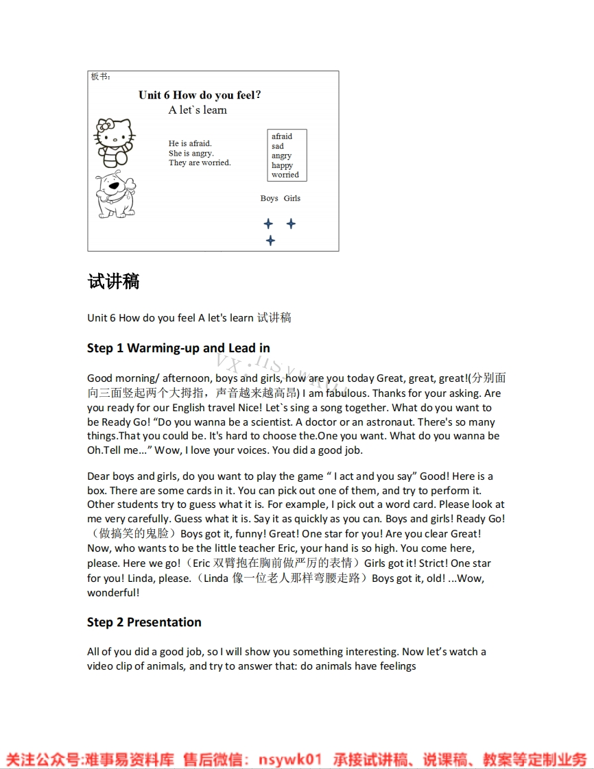 板书:Unit 6 How do you feel?A let's leamnafraidHe is afraid.sadShe is angry.angryThey are worried.happyworriedBoys Girls试讲稿Unit6 How do you feel A let''s learn试讲稿Step 1 Warming-up and Lead inGood morning/afternoon,boys and girls,how are you today Great,great,great!(向三面竖起两个大拇指,声音越来越高昂)I am fabulous.Thanks for your asking.Areyou ready for our English travel Nice!Let's sing a song together.What do you want tobe Ready Go!"Do you wanna be a scientist.A doctor or an astronaut.There's so manythings.That you could be.It's hard to choose the.One you want.What do you wanna beOh.Tell me..."Wow,I love your voices.You did a good job.Dear boys and girls,do you want to play the game "I act and you say"Good!Here is abox.There are some cards in it.You can pick out one of them,and try to perform it.Other students try to guess what it is.For example,I pick out a word card.Please look atme very carefully.Guess what it is.Say it as quickly as you can.Boys and girls!Ready Go!(做搞笑的鬼脸)Boys got it,.funny!Great!One star for you!Are you clear Great!Now,who wants to be the little teacher Eric,your hand is so high.You come here,please..Here we go!(Eric双臂抱在胸前做严厉的表情)Girls got it!Strict!One starfor you!Linda,please.(Linda像一位老人那样弯腰走路)Boys got it,old!Wow,wonderful!Step 2 PresentationAll of you did a good job,so I will show you something interesting.Now let's watch avideo clip of animals,and try to answer that:do animals have feelings关注公众号:难事易资料库售后微信:5ywk01承接试讲稿、说课稿、教案等定制业务