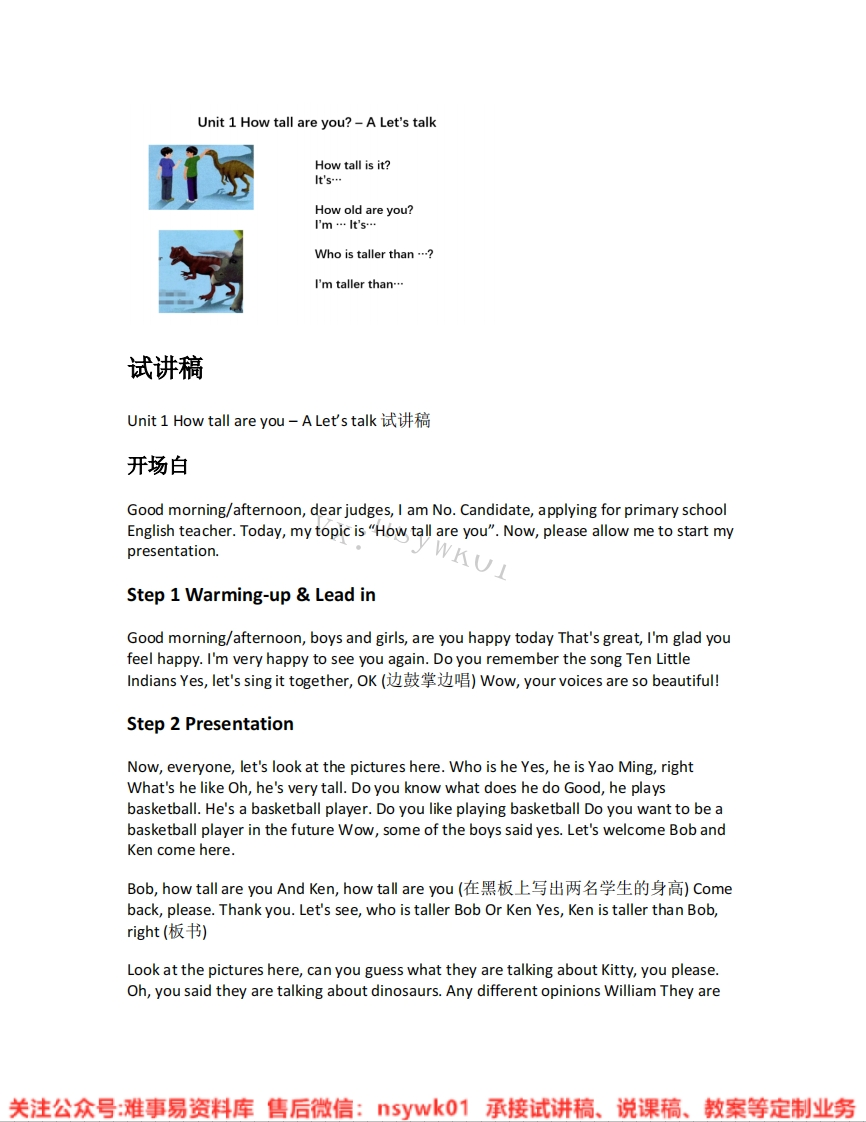 Unit 1 How tall are you?-A Let's talkHow tall is it?lt's…How old are you?m…lt's…Who is taller than?I'm taller than...试讲稿Unit1 How tall are you-A Let's talk试讲稿开场白Good morning/afternoon,dear judges,I am No.Candidate,applying for primary schoolEnglish teacher.Today,my topic is"How tall are you".Now,please allow me to start mypresentation.WKUIStep 1 Warming-up Lead inGood morning/afternoon,boys and girls,are you happy today That's great,I'm glad youfeel happy.I'm very happy to see you again.Do you remember the song Ten LittleIndians Yes,,let's sing it together,OK(边鼓掌边唱)Wow,your voices are so beautiful!Step 2 PresentationNow,everyone,let's look at the pictures here.Who is he Yes,he is Yao Ming,rightWhat's he like Oh,he's very tall.Do you know what does he do Good,he playsbasketball.He's a basketball player.Do you like playing basketball Do you want to be abasketball player in the future Wow,some of the boys said yes.Let's welcome Bob andKen come here.Bob,how tall are you And Ken,how tall are you(在黑板上写出两名学生的身高)Comeback,please.Thank you.Let's see,who is taller Bob Or Ken Yes,Ken is taller than Bob,right(板书)Look at the pictures here,can you guess what they are talking about Kitty,you please.Oh,you said they are talking about dinosaurs.Any different opinions William They are关注公众号:难事易资料库售后微信:5ywk01承接试讲稿、说课稿、教案等定制业务