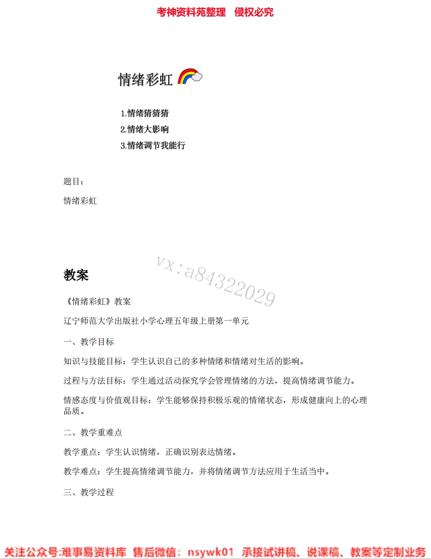 考神资料苑整理侵权必究情绪彩虹1.情绪猜猜猜2.情绪大影响3.情绪调节我能行题目:情绪彩虹教案vx:a84322029《情绪彩虹》教案辽宁师范大学出版社小学心理五年级上册第一单元一、教学目标知识与技能目标:学生认识自己的多种情绪和情绪对生活的影响。过程与方法目标:学生通过活动探究学会管理情绪的方法,提高情绪调节能力。情感态度与价值观目标:学生能够保持积极乐观的情绪状态,形成健康向上的心理品质。二、教学重难点教学重点:学生认识情绪,正确识别表达情绪。教学难点:学生提高情绪调节能力,并将情绪调节方法应用于生活当中。三、教学过程关注公众号:难事易资料库售后微信:5ywk01承接试讲稿、说课稿、教案等定制业务