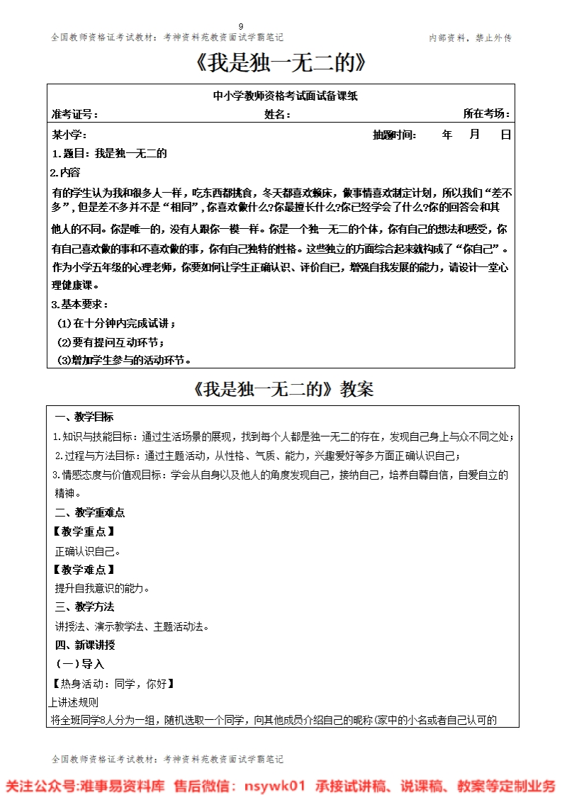 9全国数师资格证考试数材:考神资料苑藏资面试学霸笔记内部资料,禁止外传《我是独一无二的》中小学教师资格考试面试备课纸准考证号:姓名:所在考场:某小学:抽时间:年月日1.题目:我是独无二的2.内容有的学生认为我和限多人一样,吃东西都跳食,冬天都喜欢赖床,做事情喜欢定计划,以我们“差不多”,但是差不多并不是“相同”,你喜欢做什么?你最拉长什么?你已经学会了什么?你的回答会和哄他人的不同。你是唯一的,没有人跟你一模一样。你是一个独无二的个体,你有自己的想法和感受,你有自己喜欢做的事和不喜欢做的事,你有自己独特的性格。这些独立的防面踪合起来就构城了“你自己”。作为小学五年级的心理老师,你要如向让学生正确认识、评价自已,赠强自我发展的能动,请设计一堂心理健康课。3.基本要求:(1)在十分钟内完诚试讲;(2)要有提问互动环节;(3)增加学生参与的活动环节。《我是独一无二的》教案一、教学目标1.知识与技能目标:通过生活场景的展现,找到每个人都是独一无二的存在,发现自己身上与众不同之处;2.过程与方法目标:通过主题活动,从性格、气质、能力,兴趣爱好等多方面正确认识自己;3.情感态度与价值观目标:学会从自身以及他人的角度发现自己,接纳自己,培养自尊自信,自爱自立的精神。二、数学重难点【教学重点】正确认识自己。【教学难点】提升自我意识的能动。三、教学方法讲授法、演示教学法、主题活动法。四、新课讲授(-)导入【热身活动:同学,你好】上讲述规则将全班同学8人分为一组,随机选取一个同学,向其他成员介绍自己的昵称家中的小名或者自己认可的全国教师资格证考试教材:考神资料苑教资面试学霸笔记关注公众号:准事易资料库售后微信:n5ywk01承接试讲稿、说课稿、教案等定制业务