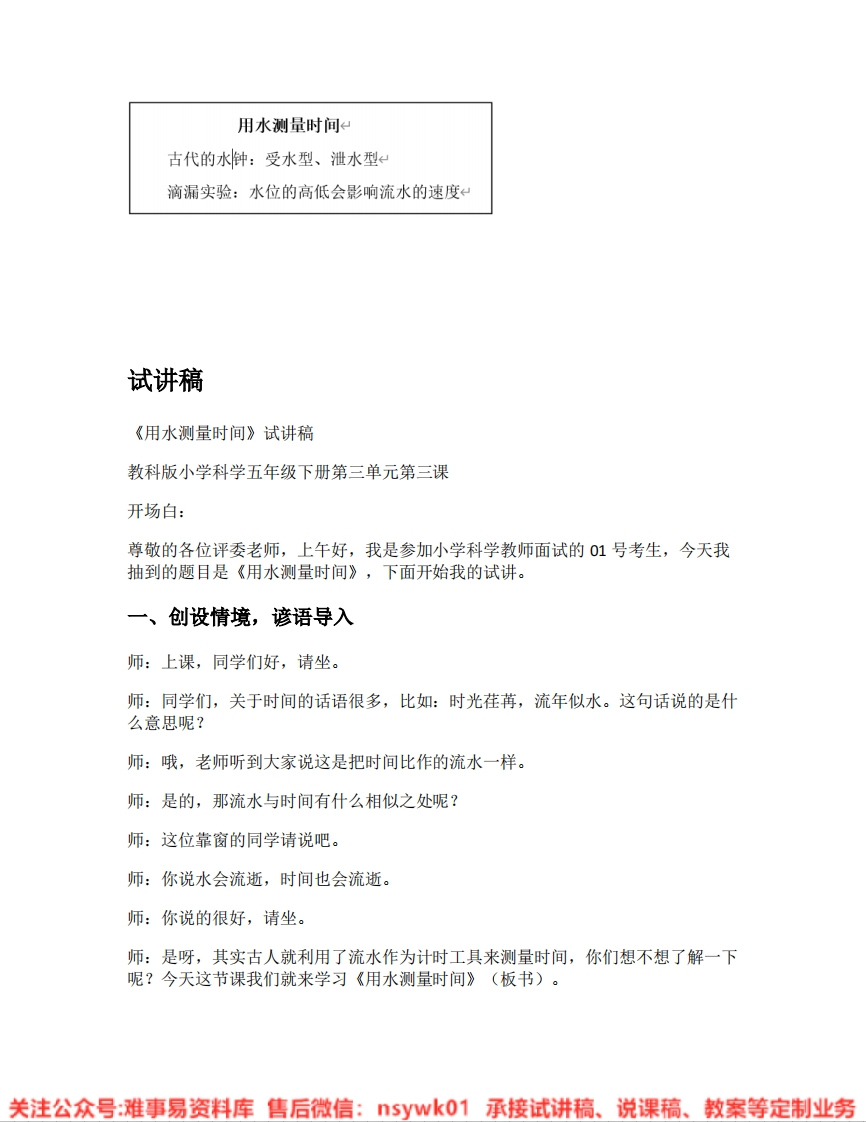 用水测量时间古代的水钟:受水型、泄水型滴漏实验:水位的高低会影响流水的速度试讲稿《用水测量时间》试讲稿教科版小学科学五年级下册第三单元第三课开场白:尊敬的各位评委老师,上午好,我是参加小学科学教师面试的01号考生,今天我抽到的题目是《用水测量时间》,下面开始我的试讲。一、创设情境,谚语导入师:上课,同学们好,请坐。师:同学们,关于时间的话语很多,比如:时光荏苒,流年似水。这句话说的是什么意思呢?师:哦,老师听到大家说这是把时间比作的流水一样。师:是的,那流水与时间有什么相似之处呢?师:这位靠窗的同学请说吧。师:你说水会流逝,时间也会流逝。师:你说的很好,请坐。师:是呀,其实古人就利用了流水作为计时工具来测量时间,你们想不想了解一下呢?今天这节课我们就来学习《用水测量时间》(板书)。关注公众号:难事易资料库售后微信:5ywk01承接试讲稿、说课稿、教案等定制业务