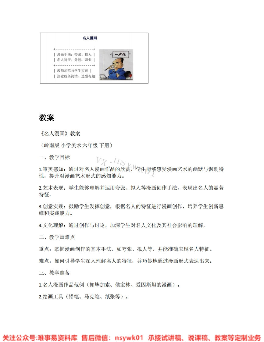 名人漫画「漫画手法:夸张、拟人|一户侯丨名人特征:外貌、职业|丨教师示范与学生实践「」注意线条简洁、造型有趣教案《名人漫画》教案(岭南版小学美术六年级下册)一、教学目标Vx.lIS1审美感知:通过对名人漫画作品的欣赏,学生能够感受漫画艺术的幽默与讽刺特性,提升对漫画艺术形式的感知能力。2艺术表现:学生能够理解并运用夸张、拟人等漫画创作手法,表现出名人的显著特征。3.创意实践:鼓励学生发挥创意,根据名人的特征进行漫画创作,培养学生创新思维和实践能力。4.文化理解:通过创作与讨论,加深学生对名人文化及其社会影响的理解。二、教学重难点重点:掌握漫画创作的基本手法,如夸张、拟人等,并能准确表现名人特征。难点:如何引导学生深入理解名人的特征,并巧妙地通过漫画形式表达出来。三、教学准备1.名人漫画作品范例(如毕加索、侯宝林、爱因斯坦的漫画)。2.绘画工具(铅笔、马克笔、纸张等)。关注公众号:难事易资料库售后微信:5ywk01承接试讲稿、说课稿、教案等定制业务