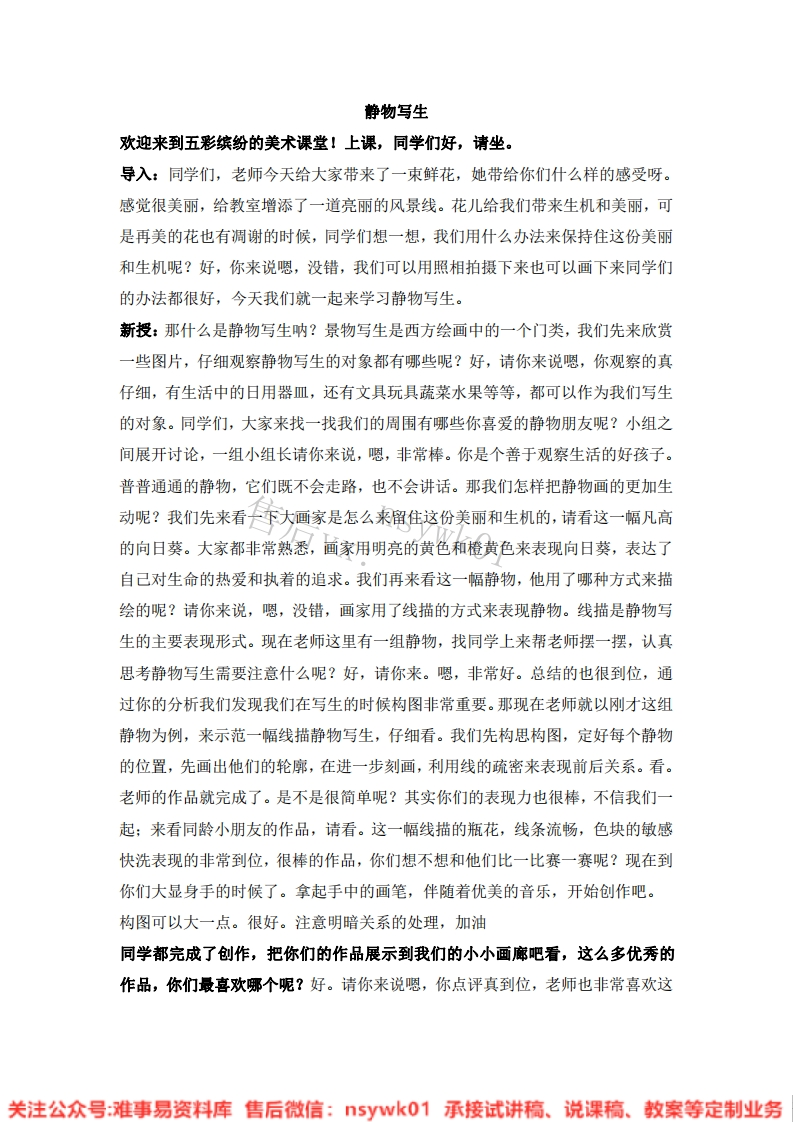 静物写生欢迎来到五彩缤纷的美术课堂!上课,同学们好,请坐。导入:同学们,老师今天给大家带来了一束鲜花,她带给你们什么样的感受呀。感觉很美丽,给教室增添了一道亮丽的风景线。花儿给我们带来生机和美丽,可是再美的花也有调谢的时候,同学们想一想,我们用什么办法来保持住这份美丽和生机呢?好,你来说嗯,没错,我们可以用照相拍摄下来也可以画下来同学们的办法都很好,今天我们就一起来学习静物写生。新授:那什么是静物写生呐?景物写生是西方绘画中的一个门类,我们先来欣赏一些图片,仔细观察静物写生的对象都有哪些呢?好,请你来说嗯,你观察的真仔细,有生活中的日用器皿,还有文具玩具蔬菜水果等等,都可以作为我们写生的对象。同学们,大家来找一找我们的周围有哪些你喜爱的静物朋友呢?小组之间展开讨论,一组小组长请你来说,嗯,非常棒。你是个善于观察生活的好孩子。普普通通的静物,它们既不会走路,也不会讲话。那我们怎样把静物画的更加生动呢?我们先来看一下大画家是怎么来留住这份美丽和生机的,请看这一幅凡高的向日葵。大家都非常熟悉,画家用明亮的黄色和橙黄色来表现向日葵,表达了自己对生命的热爱和执着的追求。我们再来看这一幅静物,他用了哪种方式来描绘的呢?请你来说,嗯,没错,画家用了线描的方式来表现静物。线描是静物写生的主要表现形式。现在老师这里有一组静物,找同学上来帮老师摆一摆,认真思考静物写生需要注意什么呢?好,请你来。嗯,非常好。总结的也很到位,通过你的分析我们发现我们在写生的时候构图非常重要。那现在老师就以刚才这组静物为例,来示范一幅线描静物写生,仔细看。我们先构思构图,定好每个静物的位置,先画出他们的轮廓,在进一步刻画,利用线的疏密来表现前后关系。看。老师的作品就完成了。是不是很简单呢?其实你们的表现力也很棒,不信我们一起:来看同龄小朋友的作品,请看。这一幅线描的瓶花,线条流畅,色块的敏感快洗表现的非常到位,很棒的作品,你们想不想和他们比一比赛一赛呢?现在到你们大显身手的时候了。拿起手中的画笔,伴随着优美的音乐,开始创作吧。构图可以大一点。很好。注意明暗关系的处理,加油同学都完成了创作,把你们的作品展示到我们的小小画廊吧看,这么多优秀的作品,你们最喜欢哪个呢?好。请你来说嗯,你点评真到位,老师也非常喜欢这关注公众号:准事易资料库售后微信:5yk01承接试讲稿、说课稿、教案等定制业务