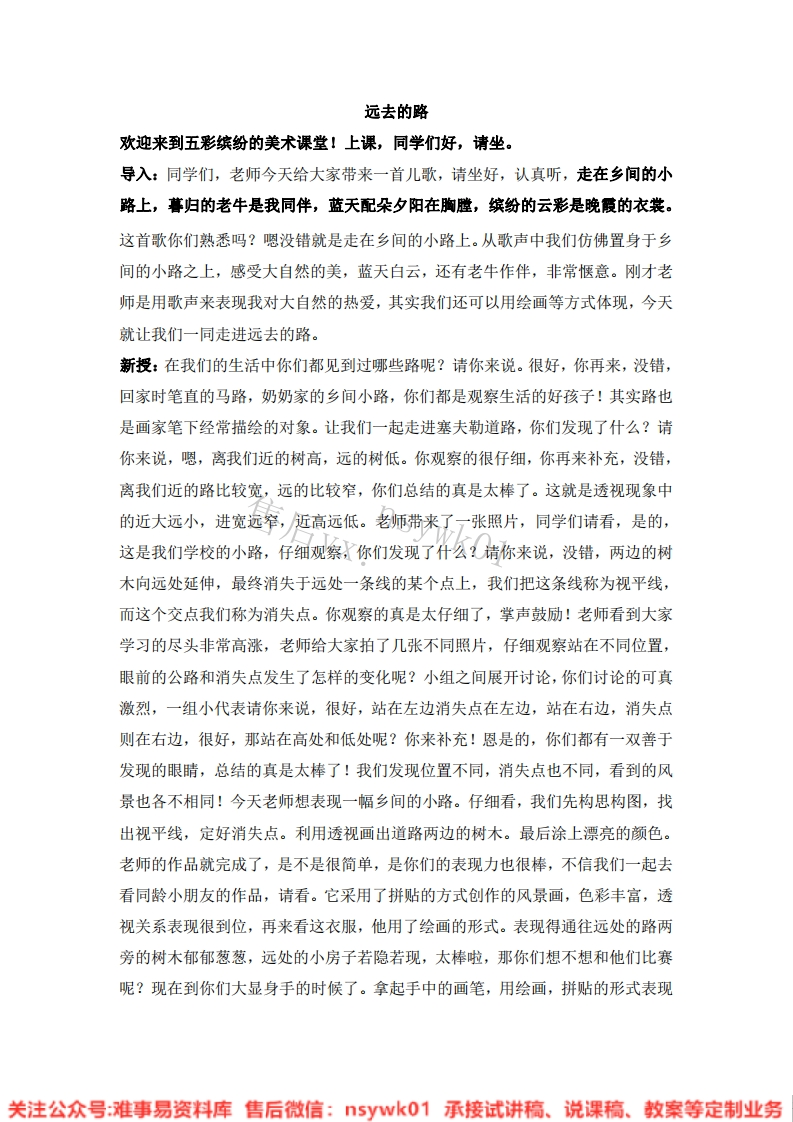 远去的路欢迎来到五彩缤纷的美术课堂!上课,同学们好,请坐。导入:同学们,老师今天给大家带来一首儿歌,请坐好,认真听,走在乡间的小路上,暮归的老牛是我同伴,蓝天配朵夕阳在胸膛,缤纷的云彩是晚霞的衣装。这首歌你们熟悉吗?嗯没错就是走在乡间的小路上。从歌声中我们仿佛置身于乡间的小路之上,感受大自然的美,蓝天白云,还有老牛作伴,非常惬意。刚才老师是用歌声来表现我对大自然的热爱,其实我们还可以用绘画等方式体现,今天就让我们一同走进远去的路。新授:在我们的生活中你们都见到过哪些路呢?请你来说。很好,你再来,没错,回家时笔直的马路,奶奶家的乡间小路,你们都是观察生活的好孩子!其实路也是画家笔下经常描绘的对象。让我们一起走进塞夫勒道路,你们发现了什么?请你来说,嗯,离我们近的树高,远的树低。你观察的很仔细,你再来补充,没错,离我们近的路比较宽,远的比较窄,你们总结的真是太棒了。这就是透视现象中的近大远小,进宽远窄,近高远低。老师带来了一张照片,同学们请看,是的,这是我们学校的小路,仔细观察,你们发现了什么?请你来说,没错,两边的树木向远处延伸,最终消失于远处一条线的某个点上,我们把这条线称为视平线,而这个交点我们称为消失点。你观察的真是太仔细了,掌声鼓励!老师看到大家学习的尽头非常高涨,老师给大家拍了几张不同照片,仔细观察站在不同位置,眼前的公路和消失点发生了怎样的变化呢?小组之间展开讨论,你们讨论的可真激烈,一组小代表请你来说,很好,站在左边消失点在左边,站在右边,消失点则在右边,很好,那站在高处和低处呢?你来补充!恩是的,你们都有一双善于发现的眼睛,总结的真是太棒了!我们发现位置不同,消失点也不同,看到的风景也各不相同!今天老师想表现一幅乡间的小路。仔细看,我们先构思构图,找出视平线,定好消失点。利用透视画出道路两边的树木。最后涂上漂亮的颜色。老师的作品就完成了,是不是很简单,是你们的表现力也很棒,不信我们一起去看同龄小朋友的作品,请看。它采用了拼贴的方式创作的风景画,色彩丰富,透视关系表现很到位,再来看这衣服,他用了绘画的形式。表现得通往远处的路两旁的树木郁郁葱葱,远处的小房子若隐若现,太棒啦,那你们想不想和他们比赛呢?现在到你们大显身手的时候了。拿起手中的画笔,用绘画,拼贴的形式表现关注公众号:准事易资料库售后微信:5yk01承接试讲稿、说课稿、教案等定制业务