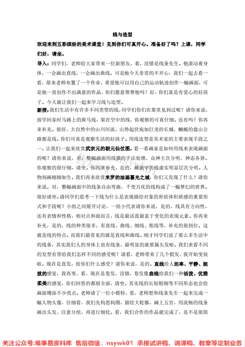 线与造型欢迎来到五彩缤纷的美术课堂!见到你们可真开心。准备好了吗?上课,同学们好,请坐。导入:同学们,老师给大家带来一位新朋友,看,没错是线条先生。他滚动着身体,一会画出直线,一会画出曲线。可是他今天非常的不开心,我们一起去看一看,原来老师布置了一个作业,希望他可以用自己的运动轨迹创作一幅画面,可是他一直创作不出满意的作品,你们愿意帮帮他吗?好,你们真是有爱心的好孩子。今天就让我们一起来学习线与造型。新授:我们生活中有许多不同类型的线,同学们你们在那里见到过呢?请你来说,放学回家时马路上的斑马线,架在空中的线,你观察的可真仔细。还有吗?你再来补充。很好,大自然中的山川河流,山势起伏宛如巨龙的长城,蜿蜒的盘山公路都是线。你们可真是观察生活的好孩子。用线造型是美术家的主要表现手段之一。让我们一起来欣赏武宗元的朝元仙仗图,看一看画家是如何用线来表现画面的呢?请你来说,对整幅画面用线描的手法处理,众神主次分明,神态各异。你观察的很仔细,请坐。你再来补充,是的,画面中的线虚实明显层次分明。人物刻画栩栩如生。我们再来欣赏米罗的油画暮光之城,你们又发现了什么?请你来说。对,整幅画面中的线条自由弯曲,千变万化的线构成了一幅梦幻的世界。很好请坐。请同学们思考一下线为什么是表现描绘对象的形状体积质感的重要形式和手段呢?小组之间展开讨论,一组小代表请你来说,是的,线具有方向性,还有表情和性格,相对点和面而言,线是最活泼最富于变化的表现元素。你再来补充,是的,线的种类很多,有直线、曲线、细线、粗线等,补充的很到位。这就是线的特点。而我们最常见的就是直线和曲线。刚才同学们说了那么多生活中的线条,其实我们人的身体上也有线条,最明显的就要属头发啦。我们来看不同的发型有带给我们怎样不同的感受呢?请看,老师带来了几个假发,我开始变装啦。现在是直发,给你们什么感受?请你来说,是的。直线给人坦率、平静、挺拔的感觉,我再变,看,现在是卷发,没错,卷发像曲线给我们一种活泼、优雅柔美的感觉,你们回答的都很全面,请坐。其实线的长短粗细等不同形态也会给画面增添不少亮点。老师请了一位小模特,看,老师想和线条先生一起来完成一幅人物头像,仔细看,我们先构思构图,描绘大轮廓,画上五官,用流畅的线条画出头发,注意分组,再进行细化。看,我们合作的作品就完成了,是不是很简关注公众号:难事易资料库售后微信:5ywk01承接试讲稿、说课稿、教案等定制业务