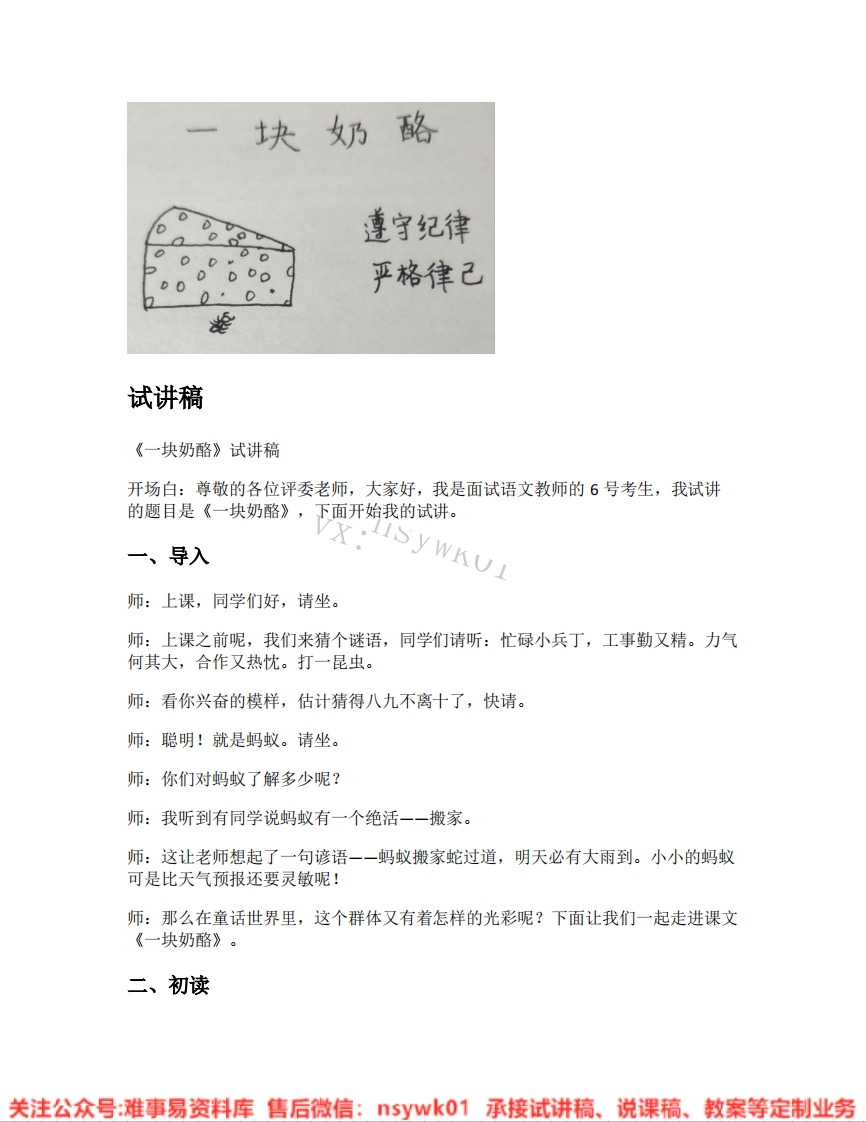 块乃酪0遵宇纪律D bO乎格律己00·姿试讲稿《一块奶酪》试讲稿开场白:尊敬的各位评委老师,大家好,我是面试语文教师的6号考生,我试讲的题目是《一块奶酪》,下面开始我的试讲。一、导入SyWRU1师:上课,同学们好,请坐。师:上课之前呢,我们来猜个谜语,同学们请听:忙碌小兵丁,工事勤又精。力气何其大,合作又热忱。打一昆虫。师:看你兴奋的模样,估计猜得八九不离十了,快请。师:聪明!就是蚂蚁。请坐。师:你们对蚂蚁了解多少呢?师:我听到有同学说蚂蚁有一个绝活一一搬家。师:这让老师想起了一句谚语一一蚂蚁搬家蛇过道,明天必有大雨到。小小的蚂蚁可是比天气预报还要灵敏呢!师:那么在童话世界里,这个群体又有着怎样的光彩呢?下面让我们一起走进课文《一块奶酪》。二、初读关注公众号:难事易资料库售后微信:5ywk01承接试讲稿、说课稿、教案等定制业务