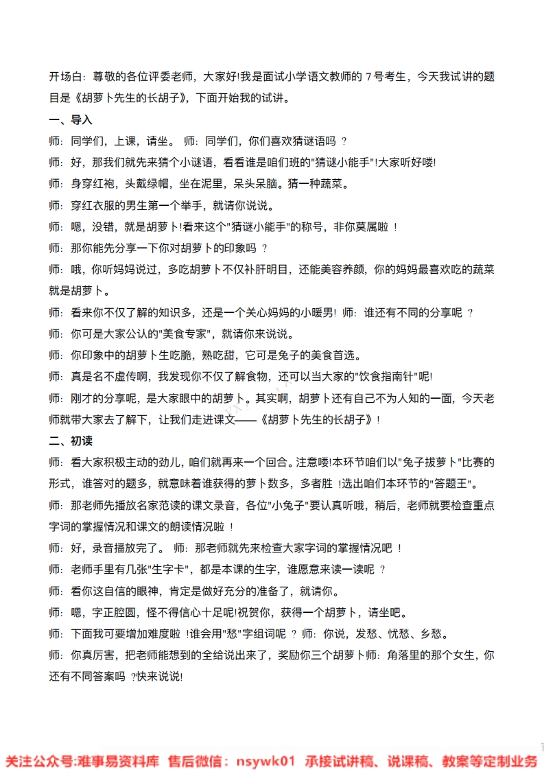 开场白:尊敬的各位评委老师,大家好我是面试小学语文教师的7号考生,今天我试讲的题目是《胡萝卜先生的长胡子》,下面开始我的试讲。一、导入师:同学们,上课,请坐。师:同学们,你们喜欢猜谜语吗?师:好,那我们就先来猜个小谜语,看看谁是咱们班的"猜谜小能手"大家听好喽!师:身穿红袍,头戴绿帽,坐在泥里,呆头呆脑。猜一种蔬菜。师:穿红衣服的男生第一个举手,就请你说说。师:嗯,没错,就是胡萝卜看来这个"猜谜小能手"的称号,非你莫属啦!师:那你能先分享一下你对胡萝卜的印象吗?师:哦,你听妈妈说过,多吃胡萝卜不仅补肝明目,还能美容养颜,你的妈妈最喜欢吃的蔬菜就是胡萝卜。师:看来你不仅了解的知识多,还是一个关心妈妈的小暖男!师:谁还有不同的分享呢?师:你可是大家公认的"美食专家”,就请你来说说。师:你印象中的胡萝卜生吃脆,熟吃甜,它可是兔子的美食首选。师:真是名不虚传啊,我发现你不仅了解食物,还可以当大家的"饮食指南针"呢!师:刚才的分享呢,是大家眼中的胡萝卜。其实啊,胡萝卜还有自己不为人知的一面,今天老师就带大家去了解下,让我们走进课文一《胡萝卜先生的长胡子》!二、初读师:看大家积极主动的劲儿,咱们就再来一个回合。注意喽本环节咱们以"兔子拔萝卜"比赛的形式,谁答对的题多,就意味着谁获得的萝卜数多,多者胜选出咱们本环节的"答题王"。师:那老师先播放名家范读的课文录音,各位”小兔子"要认真听哦,稍后,老师就要检查重点字词的掌握情况和课文的朗读情况啦!师:好,录音播放完了。师:那老师就先来检查大家字词的掌握情况吧!师:老师手里有几张"生字卡",都是本课的生字,谁愿意来读一读呢?师:看你这自信的眼神,肯定是做好充分的准备了,就请你。师:嗯,字正腔圆,怪不得信心十足呢祝贺你,获得一个胡萝卜,请坐吧。师:下面我可要增加难度啦!谁会用"愁"字组词呢?师:你说,发愁、忧愁、乡愁。师:你真厉害,把老师能想到的全给说出来了,奖励你三个胡萝卜师:角落里的那个女生,你还有不同答案吗?快来说说!关注公众号:难事易资料库售后微信:5ywk01承接试讲稿、说课稿、教案等定制业务
