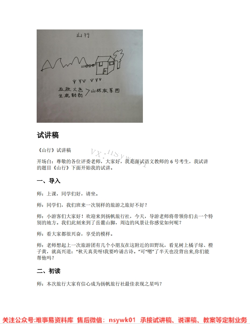 山行wY YV VYY五欲天色)山林放罩图生机动劲试讲稿《山行》试讲稿开场白:尊敬的各位评委老师,大家好,我是面试语文教师的6号考生,我试讲的题目《山行》下面开始我的试讲。一、导入师:上课,同学们好,请坐。师:同学们,我们班来一次别样的旅游之旅好不好?师:小游客们大家好欢迎来到扬帆旅行社,今天,导游老师将带领你们去一个特别的地方。我们此刻来到了岳麓山脚,周边的风景让你感觉如何呢?师:看大家都很兴奋,享受的模样。师:老师想起上一次旅游团有几个小朋友在这附近的田野玩,看见树上橘子绿、橙子黄,就高兴道:“秋天真美呀我要吟诵古诗。”可“嗯”了半天也没背出来,你们能帮他吗?二、初读师:本次旅行大家有信心成为扬帆旅行社最佳表现之星吗?关注公众号:难事易资料库售后微信:5ywk01承接试讲稿、说课稿、教案等定制业务