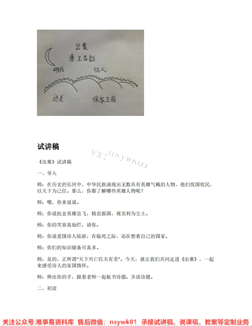 出塞唐王昌龄明月征人nanna】也关保家卫国试讲稿《出塞》试讲稿Vx:ISyWK0l一、导入师:在历史的长河中,中华民族涌现出无数具有英雄气概的人物,他们忧国忧民,以天下为己任。那么,你都了解哪些英雄人物呢?师:嗯,你来说说。师:你说抗金英雄岳飞,精忠报国,视名利为尘土。师:你的笑容真灿烂,请你。师:你说爱国诗人陆游,在临死之际,还在想着自己的国家。师:你们的知识储备可真多。师:是的,正所谓“天下兴亡匹夫有责”。今天,就让我们共同走进《出塞》,一起来感受诗人的家国情怀。师:伸出你的手,跟着老师一起板书诗题。齐读诗题。二、初读关注公众号:难事易资料库售后微信:5ywk01承接试讲稿、说课稿、教案等定制业务
