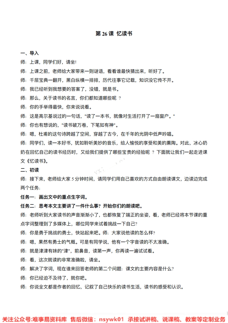 第26课忆读书一、导入师:上课,同学们好,请坐!师:上课之前,老师给大家带来一则谜语,看看谁最快猜出来,听好了。师:千层宝典一翻开,黑白纵横一排排,历代往事它记载,知识没它传不开。师:我已经听到我想要的答案了,没错,就是书。师:那么,关于读书的名言,你们都知道哪些呢?师:你的手举得最快,你来说说看。师:这是高尔基说过的一句话,"读了一本书,就像对生活打开了一扇窗户。”师:你也有想说的,"读书破万卷,下笔如有神"。师:嗯,杜甫的这句诗跨越了空间,穿越了古今,在千年的光阴中低声吟唱。师:同学们,读一本好书,犹如聆听美妙的音乐,给人愉悦的享受和美的熏陶。对此,冰心奶奶在回忆自己的读书经历时,又给我们提供了哪些宝贵的经验呢?下面就让我们一起走进课文《忆读书》。二、初读VX师:接下来,老师给大家5分钟时间,请同学们用自己喜欢的方式自由朗读课文,边读边完成两个任务:任务一:画出文中的重点生字词。任务二:思考本文主要讲了一件什么事?开始你们的朗读吧。师:老师听到大家读书的声音渐渐小了,也都恢复了端正的坐姿,看,老师已经将本节课的重点字词整理到了多媒体上,哪位同学来试着挑战一下自己?师:你是勇于挑战的勇士,快站起来吧。师:大家说他读的怎么样?师:嗯,果然有勇士的气概。可是有同学说,他有一个字音读的不太准确。师:就是津津有味的"津”,前鼻音,读第一声,你再读一遍试试看。师:看,这次就读的非常准确啦,请坐。师:解决了字词,现在谁来回答老师的第二个问题:课文的主要内容是什么?师:你已经迫不及待了,就你吧。师:你说全文都是作者的回忆,记叙了自己快乐的读书生活,读书的感受和认识。关注公众号:难事易资料库售后微信:5ywk01承接试讲稿、说课稿、教案等定制业务