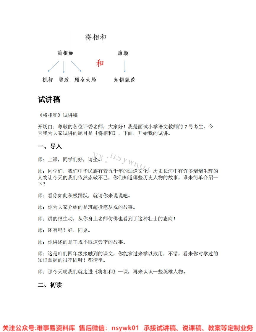 将相和蔺相如廉颇和机智勇敢顾全大局知错就改试讲稿《将相和》试讲稿开场白:尊敬的各位评委老师,大家好!我是面试小学语文教师的7号考生,今天我为大家试讲的题目是《将相和》,下面,开始我的试讲。一、导入师上误.同学好,请丝:y师:同学们,我们中华民族有着五千年的灿烂文化,历史长河中有许多熠熠生辉的人物让今天的我们依然崇敬不已,你们知道哪些历史人物的故事,谁来简单介绍一下?师:看你如此积极踊跃,就请你来说说吧。师:你为大家介绍的是班超投笔从戎的故事。师:讲的很生动,从你身上老师仿佛也看到了这种壮士的志向!师:还有吗?好,同桌。师:你讲述的是王戎不取道旁李的故事。师:这是咱们四年级接触到的课文,你能拿过来学以致用,不错,看来你对学过的知识掌握的很牢固呀!都请坐。师:那今天呢我们就走进《将相和》一课,再来认识一些英雄人物。二、初读关注公众号:难事易资料库售后微信:5ywk01承接试讲稿、说课稿、教案等定制业务