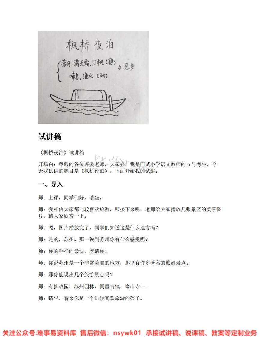枫桥夜泊落月.满天霜江枫静)暗、渔火(试讲稿《枫桥夜泊》试讲稿开场白:尊敬的各位评委老师,·大家好,我是面试小学语文教师的号考生,今天我试讲的题目是《枫桥夜泊》,下面开始我的试讲。一、导入师:上课,同学们好,请坐。师:我相信大家都比较喜欢旅游,那接下来呢,老师给大家播放几张景区的美景图片,请大家欣赏一下。师:嗯,图片播放完了,同学们知道这是什么地方吗?师:是的,苏州。那一说到苏州你有什么感受呢?师:你的手举的最快,就请你。师:你说苏州是一个非常美丽的地方,那里有许多著名的旅游景点。师:那你能说出几个旅游景点吗?师:有拙政园、苏州园林、同里古镇、寒山寺…师:请坐,看来你是一个比较喜欢旅游的孩子。关注公众号:难事易资料库售后微信:5ywk01承接试讲稿、说课稿、教案等定制业务
