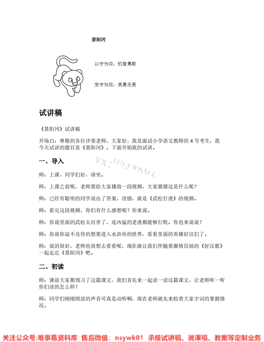 景阳冈以守为攻:机智勇敢变守为攻:英勇无畏试讲稿《景阳冈》试讲稿开场白:尊敬的各位评委老师,大家好,我是面试小学语文教师的4号考生,我今天试讲的题目是《景阳冈》。下面开始我的试讲。一、导入Vx:HISyWKU1师:上课,同学们好,请坐。师:上课之前呢,老师要给大家播放一段视频,大家猜猜这是什么呢?师:已经有聪明的同学说出了答案,没错,就是《武松打虎》的视频。师:看完这段视频,你们有什么感想呢?你来说。师:你说里面的武松太厉害了,连凶猛的老虎都能够打败。你也来说说?师:你说你迫不及待的想要进入水浒传的世界,看看里面的英雄好汉们了。师:说的很好,老师也很想去看看呢,现在就让我们伴随着激情昂扬的《好汉歌》一起走近《景阳冈》吧。二、初读师:课前大家都预习了这篇课文,我们首先来一起读一读这篇课文,让老师听一听你们读的怎么样?师:同学们刚刚朗读的声音可真是动听啊,现在老师就先来检查大家字词的掌握情况。关注公众号:难事易资料库售后微信:5ywk01承接试讲稿、说课稿、教案等定制业务