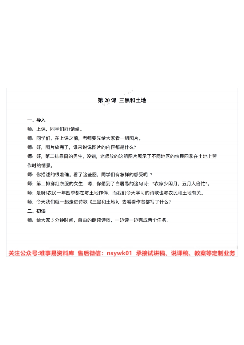 第20课三黑和土地一、导入师:上课,同学们好1请坐。师:同学们,在上课之前,老师要先给大家看一组图片。师:好,图片放完了,谁来说说图片的内容都是什么?师:好,第二排靠窗的男生。没错,老师放的这组图片展示了不同地区的农民四季在土地上劳作时的情景。师:你描述的很准确。看了这些图,同学们有怎样的感受呢?师:第二排穿红衣服的女生,嗯,你想到了白居易的这句诗:"农家少闲月,五月人倍忙"。师:是呀农民一年四季都在与土地作伴,而我们今天学习的诗歌也与农民和土地有关。师:今天我们就一起走进诗歌《三黑和土地》,去看看作者都写了什么?二、初读师:给大家5分钟时间,自由的朗读诗歌,一边读一边完成两个任务。关注公众号:难事易资料库售后微信:n5ywk01承接试讲稿、说课稿、教案等定制业务