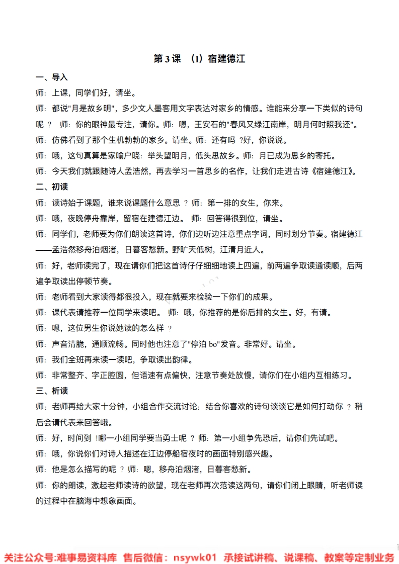 第3课(1)宿建德江一、导入师:上课,同学们好,请坐。师:都说"月是故乡明”,多少文人墨客用文字表达对家乡的情感。谁能来分享一下类似的诗句呢?师:你的眼神最专注,请你。师:嗯,王安石的"春风又绿江南岸,明月何时照我还"。师:仿佛看到了那个生机勃勃的家乡。请坐。师:还有吗?好,你说说。师:哦,这句真算是家喻户晓:举头望明月,低头思故乡。师:月已成为思乡的寄托。师:今天我们就跟随诗人孟浩然,再去学习一首思乡的名作,让我们走进古诗《宿建德江》。二、初读师:读诗始于课题,谁来说课题什么意思?师:第一排的女生,你来。师:哦,夜晚停舟靠岸,留宿在建德江边。师:回答得很到位,请坐。师:同学们,老师要为你们朗读这首诗,你们边听边注意重点字词,同时划分节奏。宿建德江一孟浩然移舟泊烟渚,日暮客愁新。野旷天低树,江清月近人。师:好,老师读完了,现在请你们把这首诗仔仔细细地读上四遍,前两遍争取读通读顺,后两遍争取读出停顿节奏。师:老师看到大家读得都很投入,现在就要来检验一下你们的成果。师:课代表请推荐一位同学来读吧。师:哦,你推荐的是你后排的女生。好,有请。师:嗯,这位男生你说她读的怎么样?师:声音清脆,通顺流畅。同时他也注意了"停泊o"发音。非常好。请坐。师:我们全班再来读一读吧,争取读出韵律。师:非常整齐、字正腔圆,但语速有点偏快,注意节奏处放慢,请你们在小组内互相练习。三、析读师:老师再给大家十分钟,小组合作交流讨论:结合你喜欢的诗句谈谈它是如何打动你?稍后会请代表来回答峨。师:好,时间到!哪一小组同学要当勇士呢?师:第一小组争先恐后,请你们先试吧。师:哦,你说你们对诗人描述在江边停船宿夜时的画面特别感兴趣。师:他是怎么描写的呢?师:嗯,移舟泊烟渚,日暮客愁新。师:你的朗读,激起老师读诗的欲望,现在老师再次范读这两句,请你们闭上眼晴,听老师读的过程中在脑海中想象画面。关注公众号:难事易资料库售后微信:5ywk01承接试讲稿、说课稿、教案等定制业务