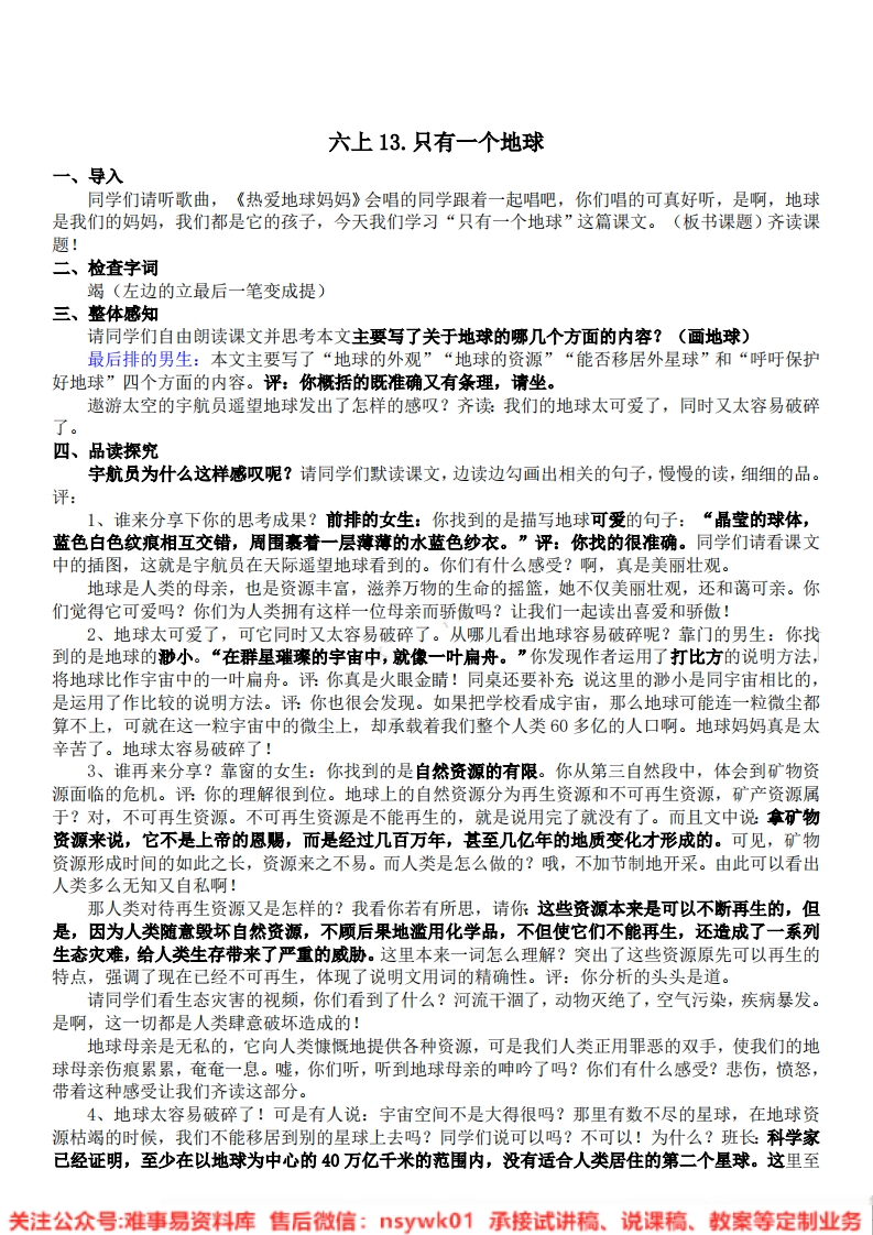 六上13.只有一个地球一、导入同学们请听歌曲,《热爱地球妈妈》会唱的同学跟着一起唱吧,你们唱的可真好听,是啊,地球是我们的妈妈,我们都是它的孩子,今天我们学习“只有一个地球”这篇课文。(板书课题)齐读课题!二、检查字词竭(左边的立最后一笔变成提)三、整体感知请同学们自由朗读课文并思考本文主要写了关于地球的哪几个方面的内容?(画地球)最后排的男生:本文主要写了“地球的外观”“地球的资源”“能否移居外星球”和“呼吁保护好地球”四个方面的内容。评:你概括的既准确又有条理,请坐。遨游太空的宇航员遥望地球发出了怎样的感叹?齐读我们的地球太可爱了,同时又太容易破碎了。四、品读探究宇航员为什么这样感叹呢?请同学们默读课文,边读边勾画出相关的句子,慢慢的读,细细的品。评:1、谁来分享下你的思考成果?前排的女生:你找到的是描写地球可爱的句子:“晶莹的球体,蓝色白色纹痕相互交错,周围表着一层薄薄的水蓝色纱衣。”评:你找的很准确。同学们请看课文中的插图,这就是宇航员在天际遥望地球看到的。你们有什么感受?啊,真是美丽壮观。地球是人类的母亲,也是资源丰富,滋养万物的生命的摇篮,她不仅美丽壮观,还和蔼可亲。你们觉得它可爱吗?你们为人类拥有这样一位母亲而骄傲吗?让我们一起读出喜爱和骄傲!2、地球太可爱了,可它同时又太容易破碎了。从哪儿看出地球容易破碎呢?靠门的男生:你找到的是地球的渺小。“在群星璀璨的宇宙中,就像一叶扁舟。”你发现作者运用了打比方的说明方法,将地球比作宇宙中的一叶扁舟。评你真是火眼金睛!同桌还要补充说这里的渺小是同宇宙相比的,是运用了作比较的说明方法。评你也很会发现。如果把学校看成宇宙,那么地球可能连一粒微尘都算不上,可就在这一粒宇宙中的微尘上,却承载着我们整个人类60多亿的人口啊。地球妈妈真是太辛苦了。地球太容易破碎了!3、谁再来分享?靠窗的女生:你找到的是自然资源的有限。你从第三自然段中,体会到矿物资源面临的危机。评你的理解很到位。地球上的自然资源分为再生资源和不可再生资源,矿产资源属于?对,不可再生资源。不可再生资源是不能再生的,就是说用完了就没有了。而且文中说拿矿物资源来说,它不是上帝的恩赐,而是经过几百万年,甚至几亿年的地质变化才形成的。可见,矿物资源形成时间的如此之长,资源来之不易。而人类是怎么做的?哦,不加节制地开采。由此可以看出人类多么无知又自私啊!那人类对待再生资源又是怎样的?我看你若有所思,请你这些资源本来是可以不断再生的,但是,因为人类随意毁坏自然资源,不顾后果地滥用化学品,不但使它们不能再生,还造成了一系列生态灾难,给人类生存带来了严重的威胁。这里本来一词怎么理解?突出了这些资源原先可以再生的特点,强调了现在已经不可再生,体现了说明文用词的精确性。评:你分析的头头是道。请同学们看生态灾害的视频,你们看到了什么?河流干涸了,动物灭绝了,空气污染,疾病暴发。是啊,这一切都是人类肆意破坏造成的!地球母亲是无私的,它向人类慷慨地提供各种资源,可是我们人类正用罪恶的双手,使我们的地球母亲伤痕累累,奄奄一息。嘘,你们听,听到地球母亲的呻吟了吗?你们有什么感受?悲伤,愤怒,带着这种感受让我们齐读这部分。4、地球太容易破碎了!可是有人说:宇宙空间不是大得很吗?那里有数不尽的星球,在地球资源枯竭的时候,我们不能移居到别的星球上去吗?同学们说可以吗?不可以!为什么?班长科学家己经证明,至少在以地球为中心的40万亿千米的范围内,没有适合人类居住的第二个星球。这里至关注公众号:难事易资料库售后微信:5ywk01承接试讲稿、说课稿、教案等定制业务