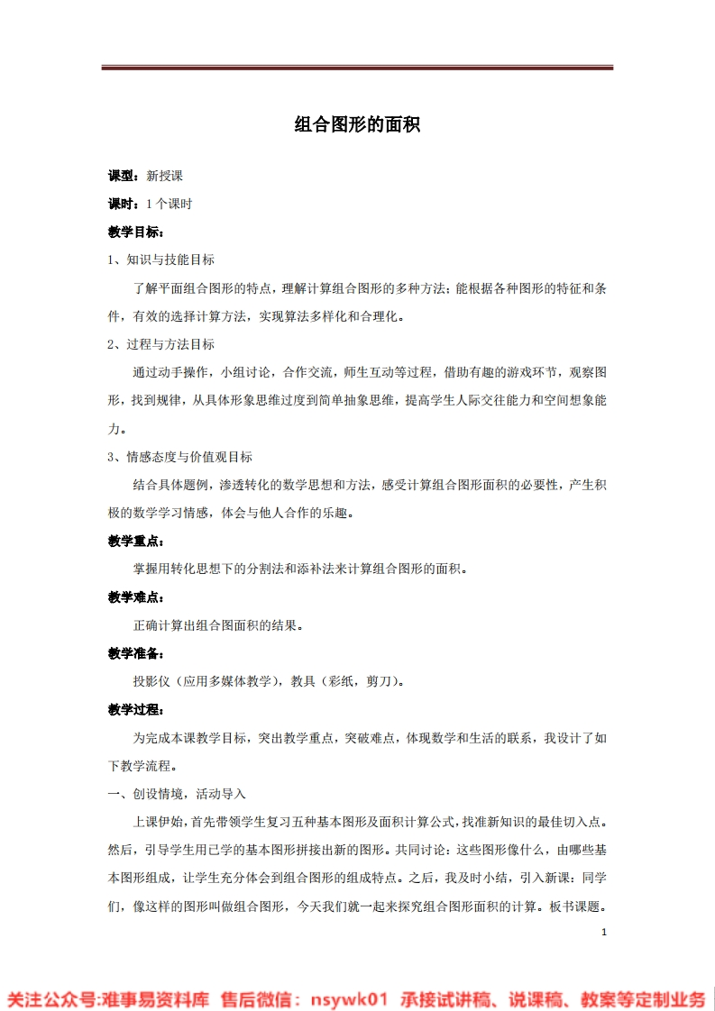 组合图形的面积课型:新授课课时:1个课时教学目标:1、知识与技能目标了解平面组合图形的特点,理解计算组合图形的多种方法:能根据各种图形的特征和条件,有效的选择计算方法,实现算法多样化和合理化。2、过程与方法目标通过动手操作,小组讨论,合作交流,师生互动等过程,借助有趣的游戏环节,观察图形,找到规律,从具体形象思维过度到简单抽象思维,提高学生人际交往能力和空间想象能力。3、情感态度与价值观目标结合具体题例,渗透转化的数学思想和方法,感受计算组合图形面积的必要性,产生积极的数学学习情感,体会与他人合作的乐趣。教学重点:掌握用转化思想下的分割法和添补法来计算组合图形的面积。教学难点:正确计算出组合图面积的结果。教学准备:投影仪(应用多媒体教学),教具(彩纸,剪刀)。教学过程:为完成本课教学目标,突出教学重点,突破难点,体现数学和生活的联系,我设计了如下教学流程。一、创设情境,活动导入上课伊始,首先带领学生复习五种基本图形及面积计算公式,找准新知识的最佳切入点。然后,引导学生用己学的基本图形拼接出新的图形。共同讨论:这些图形像什么,由哪些基本图形组成,让学生充分体会到组合图形的组成特点。之后,我及时小结,引入新课:同学们,像这样的图形叫做组合图形,今天我们就一起来探究组合图形面积的计算。板书课题。1关注公众号:难事易资料库售后微信:5ywk01承接试讲稿、说课稿、教案等定制业务